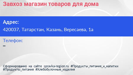 Завхоз, магазин товаров для дома по адресу 420037, Татарстан, Казань, Вересаева, 1а в дальнейшем Организация, размещена в следующих категориях: