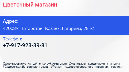 Цветочный магазин по адресу 420039, Татарстан, Казань, Гагарина, 28 к1 в дальнейшем Организация, размещена в следующих категориях: