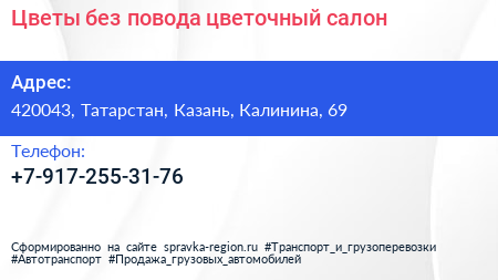 Цветы без повода, цветочный салон по адресу 420043, Татарстан, Казань, Калинина, 69 в дальнейшем Организация, размещена в следующих категориях: