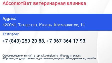 АбсолютВет, ветеринарная клиника по адресу 420061, Татарстан, Казань, Космонавтов, 14 в дальнейшем Организация, размещена в следующих категориях: