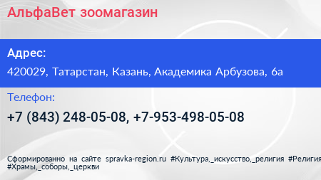 АльфаВет, зоомагазин по адресу 420029, Татарстан, Казань, Академика Арбузова, 6а в дальнейшем Организация, размещена в следующих категориях: