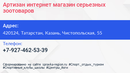 Артизан, интернет-магазин серьезных зоотоваров по адресу 420124, Татарстан, Казань, Чистопольская, 55 в дальнейшем Организация, размещена в следующих категориях: