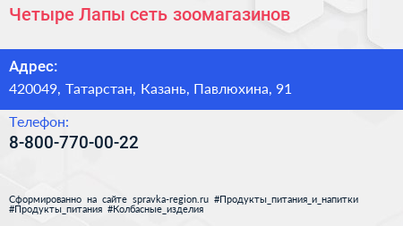 Четыре Лапы, сеть зоомагазинов по адресу 420049, Татарстан, Казань, Павлюхина, 91 в дальнейшем Организация, размещена в следующих категориях: