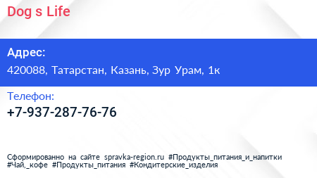 Dog`s Life по адресу 420088, Татарстан, Казань, Зур Урам, 1к в дальнейшем Организация, размещена в следующих категориях: