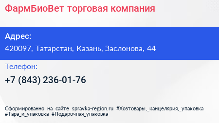ФармБиоВет, торговая компания по адресу 420097, Татарстан, Казань, Заслонова, 44 в дальнейшем Организация, размещена в следующих категориях: