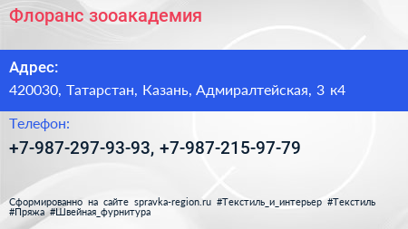 Флоранс, зооакадемия по адресу 420030, Татарстан, Казань, Адмиралтейская, 3 к4 в дальнейшем Организация, размещена в следующих категориях: