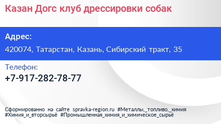 Казан Догс, клуб дрессировки собак по адресу 420074, Татарстан, Казань, Сибирский тракт, 35 в дальнейшем Организация, размещена в следующих категориях: