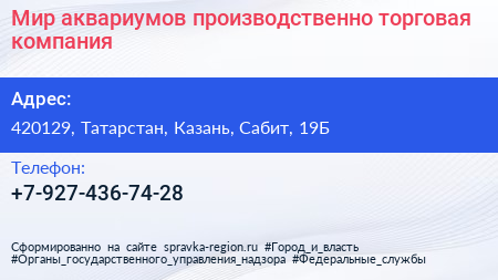 Мир аквариумов, производственно-торговая компания по адресу 420129, Татарстан, Казань, Сабит, 19Б в дальнейшем Организация, размещена в следующих категориях: