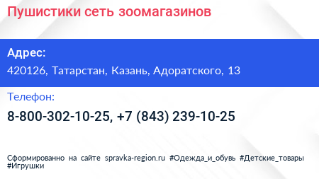 Пушистики, сеть зоомагазинов по адресу 420126, Татарстан, Казань, Адоратского, 13 в дальнейшем Организация, размещена в следующих категориях:
