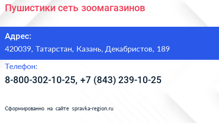 Пушистики, сеть зоомагазинов по адресу 420039, Татарстан, Казань, Декабристов, 189 в дальнейшем Организация, размещена в следующих категориях: