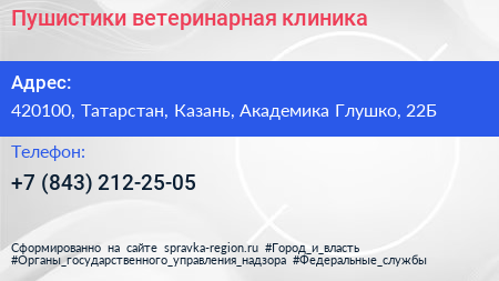 Пушистики, ветеринарная клиника по адресу 420100, Татарстан, Казань, Академика Глушко, 22Б в дальнейшем Организация, размещена в следующих категориях: