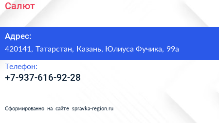 Салют по адресу 420141, Татарстан, Казань, Юлиуса Фучика, 99а в дальнейшем Организация, размещена в следующих категориях:
