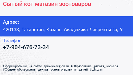 Сытый кот, магазин зоотоваров по адресу 420133, Татарстан, Казань, Академика Лаврентьева, 9 в дальнейшем Организация, размещена в следующих категориях: