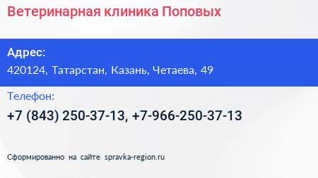 Ветеринарная клиника Поповых по адресу 420124, Татарстан, Казань, Четаева, 49 в дальнейшем Организация, размещена в следующих категориях: