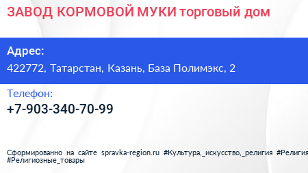 ЗАВОД КОРМОВОЙ МУКИ, торговый дом по адресу 422772, Татарстан, Казань, База Полимэкс, 2 в дальнейшем Организация, размещена в следующих категориях: