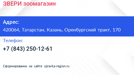 ЗВЕРИ, зоомагазин по адресу 420064, Татарстан, Казань, Оренбургский тракт, 170 в дальнейшем Организация, размещена в следующих категориях: