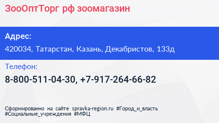 ЗооОптТорг.рф, зоомагазин по адресу 420034, Татарстан, Казань, Декабристов, 133д в дальнейшем Организация, размещена в следующих категориях: