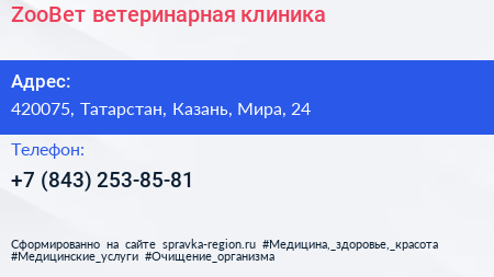ZooВет, ветеринарная клиника по адресу 420075, Татарстан, Казань, Мира, 24 в дальнейшем Организация, размещена в следующих категориях: