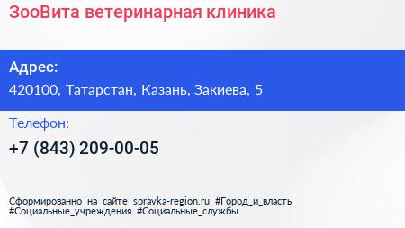 ЗооВита, ветеринарная клиника по адресу 420100, Татарстан, Казань, Закиева, 5 в дальнейшем Организация, размещена в следующих категориях: