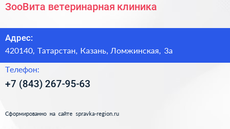 ЗооВита, ветеринарная клиника по адресу 420140, Татарстан, Казань, Ломжинская, 3а в дальнейшем Организация, размещена в следующих категориях: