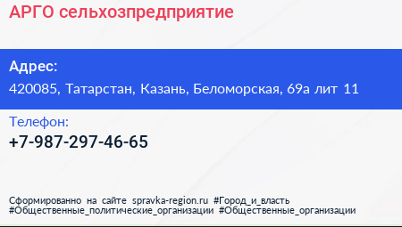 АРГО, сельхозпредприятие по адресу 420085, Татарстан, Казань, Беломорская, 69а лит 11 в дальнейшем Организация, размещена в следующих категориях: