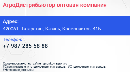АгроДистрибьютор, оптовая компания по адресу 420061, Татарстан, Казань, Космонавтов, 41Б в дальнейшем Организация, размещена в следующих категориях: