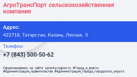 АгроТрансПорт, сельскохозяйственная компания по адресу 422718, Татарстан, Казань, Лесная, 3 в дальнейшем Организация, размещена в следующих категориях: