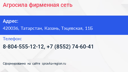 Агросила, фирменная сеть по адресу 420036, Татарстан, Казань, Тэцевская, 11Б в дальнейшем Организация, размещена в следующих категориях: