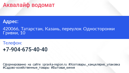 Аквалайф, водомат по адресу 420066, Татарстан, Казань, переулок Односторонки Гривки, 10 в дальнейшем Организация, размещена в следующих категориях: