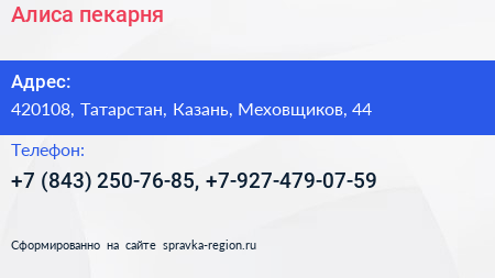 Алиса, пекарня по адресу 420108, Татарстан, Казань, Меховщиков, 44 в дальнейшем Организация, размещена в следующих категориях: