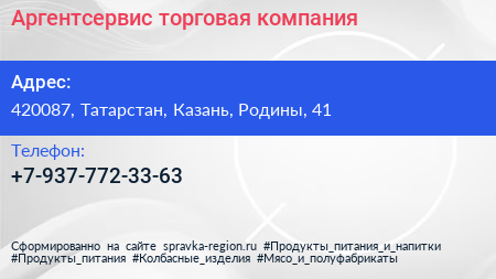 Аргентсервис, торговая компания по адресу 420087, Татарстан, Казань, Родины, 41 в дальнейшем Организация, размещена в следующих категориях: