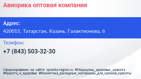 Авиорика, оптовая компания по адресу 420015, Татарстан, Казань, Галактионова, 6 в дальнейшем Организация, размещена в следующих категориях: