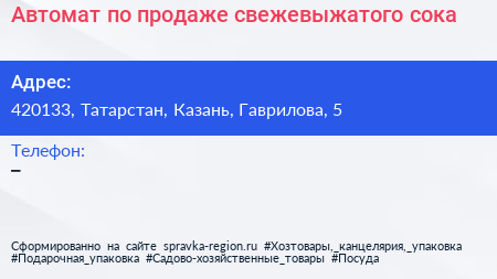 Автомат по продаже свежевыжатого сока по адресу 420133, Татарстан, Казань, Гаврилова, 5 в дальнейшем Организация, размещена в следующих категориях: