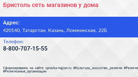 Бристоль, сеть магазинов у дома по адресу 420140, Татарстан, Казань, Ломжинская, 22Б в дальнейшем Организация, размещена в следующих категориях: