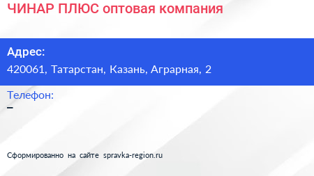 ЧИНАР ПЛЮС, оптовая компания по адресу 420061, Татарстан, Казань, Аграрная, 2 в дальнейшем Организация, размещена в следующих категориях: