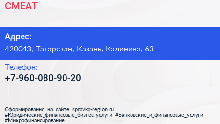 CMEAT по адресу 420043, Татарстан, Казань, Калинина, 63 в дальнейшем Организация, размещена в следующих категориях: