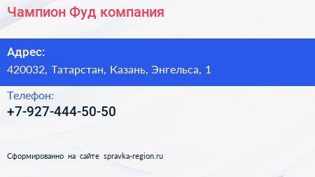 Чампион Фуд, компания по адресу 420032, Татарстан, Казань, Энгельса, 1 в дальнейшем Организация, размещена в следующих категориях: