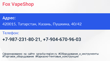 Fox VapeShop по адресу 420015, Татарстан, Казань, Пушкина, 40/42 в дальнейшем Организация, размещена в следующих категориях: