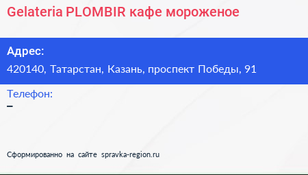 Gelateria PLOMBIR, кафе-мороженое по адресу 420140, Татарстан, Казань, проспект Победы, 91 в дальнейшем Организация, размещена в следующих категориях: