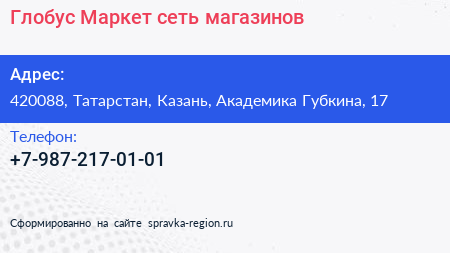 Глобус Маркет, сеть магазинов по адресу 420088, Татарстан, Казань, Академика Губкина, 17 в дальнейшем Организация, размещена в следующих категориях:
