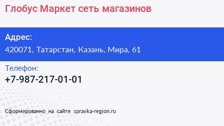 Глобус Маркет, сеть магазинов по адресу 420071, Татарстан, Казань, Мира, 61 в дальнейшем Организация, размещена в следующих категориях: