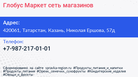 Глобус Маркет, сеть магазинов по адресу 420061, Татарстан, Казань, Николая Ершова, 57д в дальнейшем Организация, размещена в следующих категориях:
