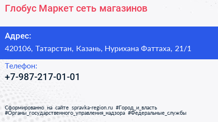 Глобус Маркет, сеть магазинов по адресу 420106, Татарстан, Казань, Нурихана Фаттаха, 21/1 в дальнейшем Организация, размещена в следующих категориях: