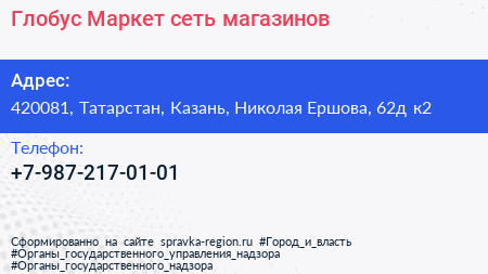 Глобус Маркет, сеть магазинов по адресу 420081, Татарстан, Казань, Николая Ершова, 62д к2 в дальнейшем Организация, размещена в следующих категориях: