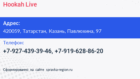 Hookah Live по адресу 420059, Татарстан, Казань, Павлюхина, 97 в дальнейшем Организация, размещена в следующих категориях: