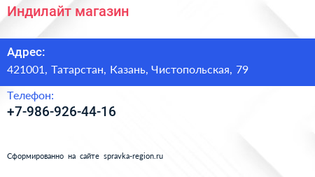 Индилайт, магазин по адресу 421001, Татарстан, Казань, Чистопольская, 79 в дальнейшем Организация, размещена в следующих категориях: