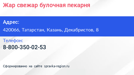 Жар свежар, булочная-пекарня по адресу 420066, Татарстан, Казань, Декабристов, 8 в дальнейшем Организация, размещена в следующих категориях: