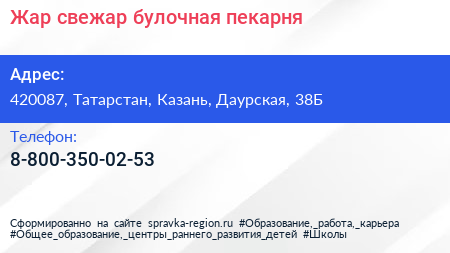 Жар свежар, булочная-пекарня по адресу 420087, Татарстан, Казань, Даурская, 38Б в дальнейшем Организация, размещена в следующих категориях: