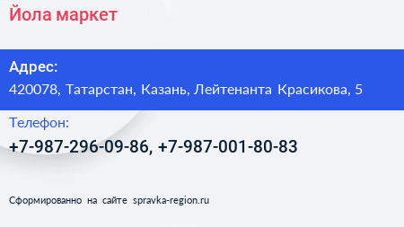 Йола-маркет по адресу 420078, Татарстан, Казань, Лейтенанта Красикова, 5 в дальнейшем Организация, размещена в следующих категориях: