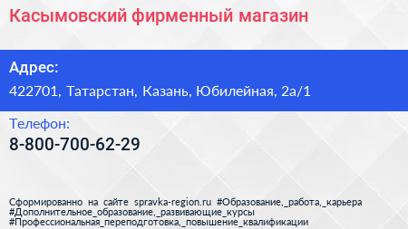 Касымовский, фирменный магазин по адресу 422701, Татарстан, Казань, Юбилейная, 2а/1 в дальнейшем Организация, размещена в следующих категориях: